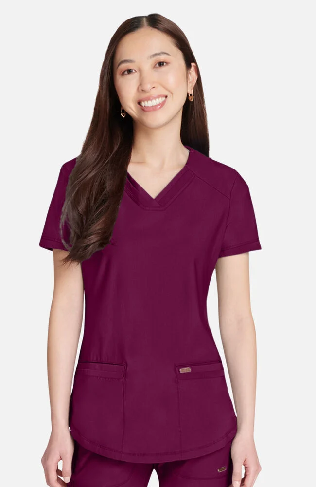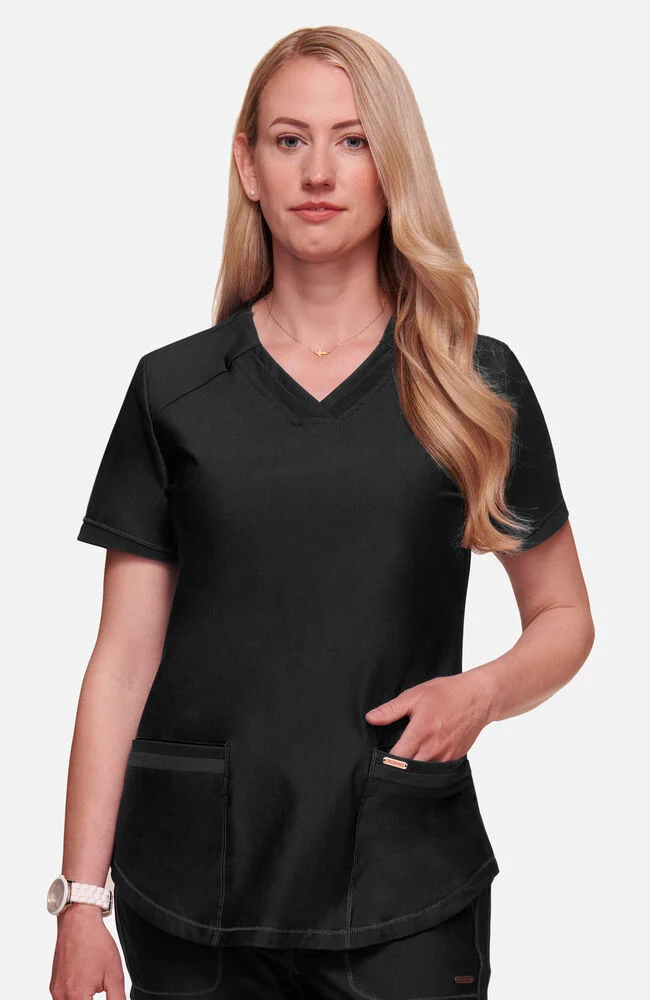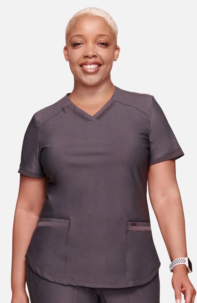 Practicality meets polished design with the FORM Curved Hemline V-Neck Top. Built with durable, easy-care fabric and a flattering contemporary fit, this top is crafted to move with you. Thoughtful details like subtle mesh accents, angled front yoke panels, and two front welt pockets elevate its functionality. The moisture-wicking nylon/spandex blend ensures lasting comfort and performance.